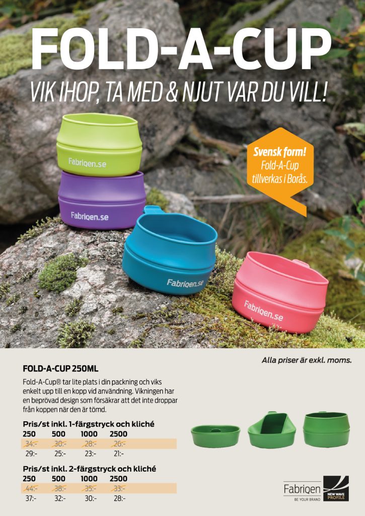 Fold-A-Cup har varit en favorit i över 40 år – enkel och smart mugg för alla som vill resa lätt. Fälls smidigt ihop till bara 3cm och öppnas till en mugg på 250ml. Gör den till din egen! Märk Fold-A-Cup med din logga och skapa en profilprodukt som uppskattas på både resan eller utflykten.